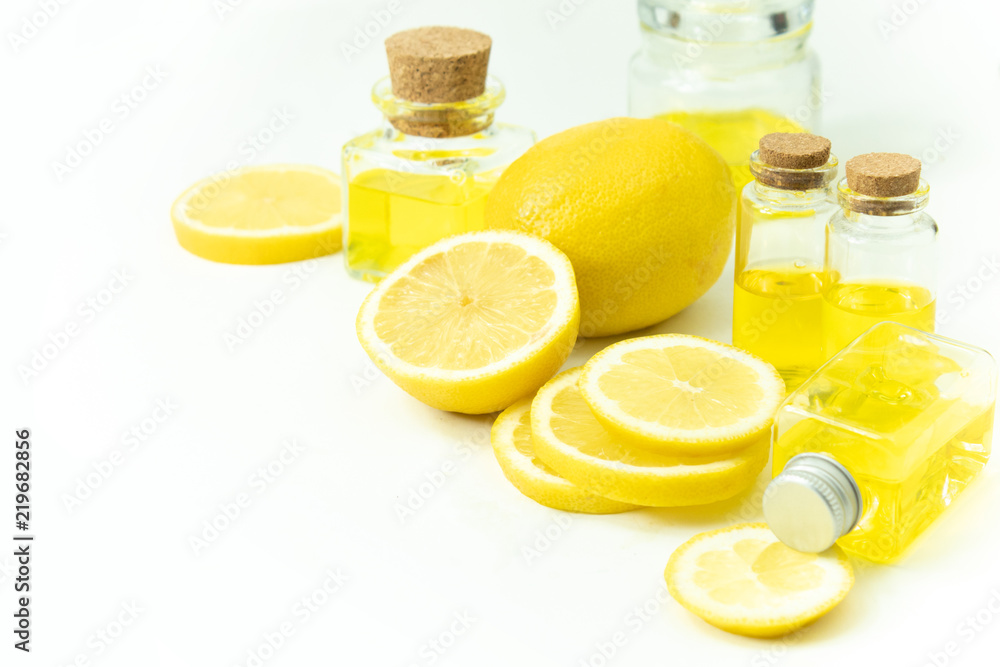 oil organic with lemon juice extract vitamin bottle in beauty skincare treatment healthy concept, top view of nutrition lemon extract for facial