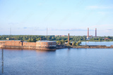 Industrial buildings and smokestacks in St Petersburg from the water