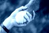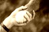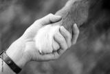 hand and paw of a big dog, a handshake with a pet. sports bracelets on hand, walk with a dog
