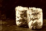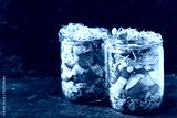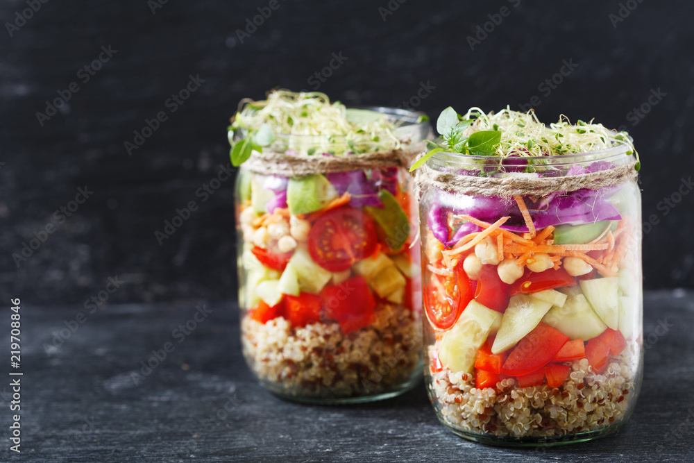 Vegetarian food. Healthy salad with quinoa and vegetables in a glass jar