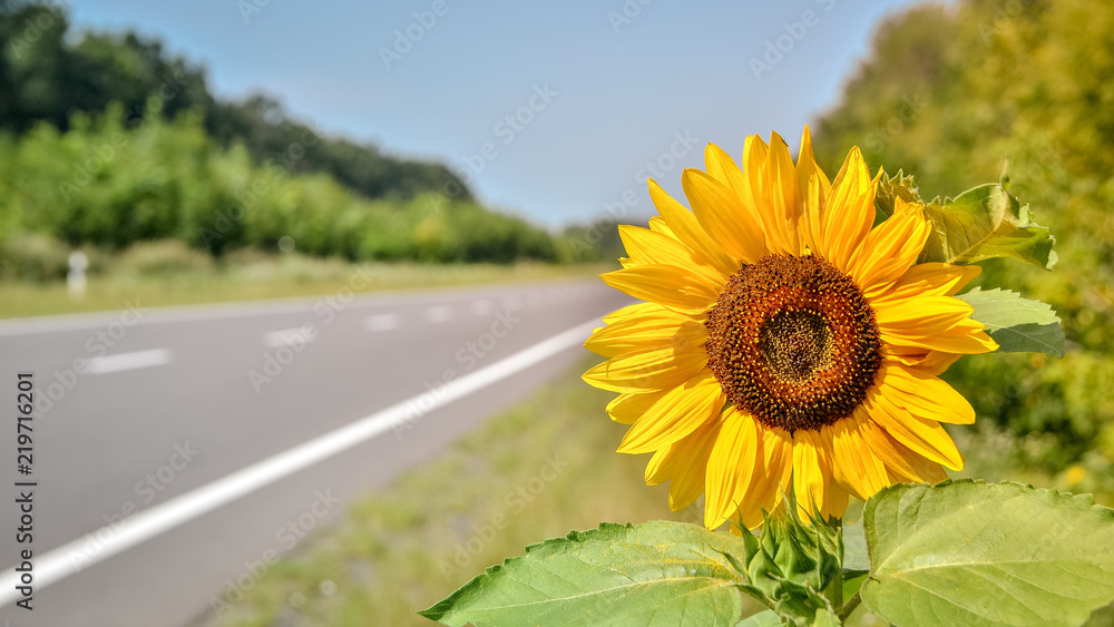 Sunflower growing at the road with blurred background. Copy space.