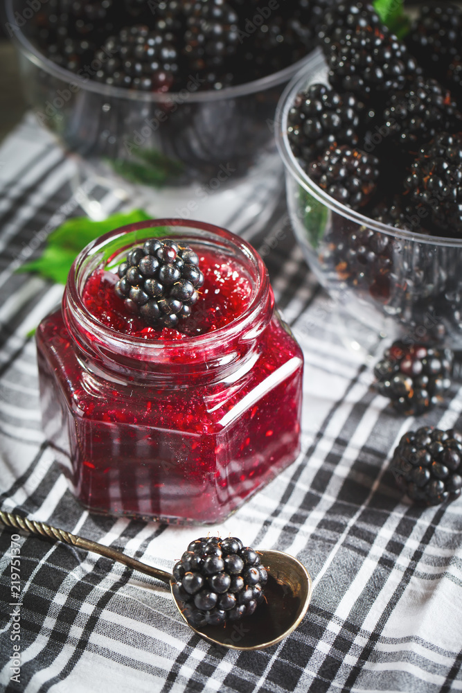 Ripe blackberry and blackberry jam on a wooden table. Dark background.