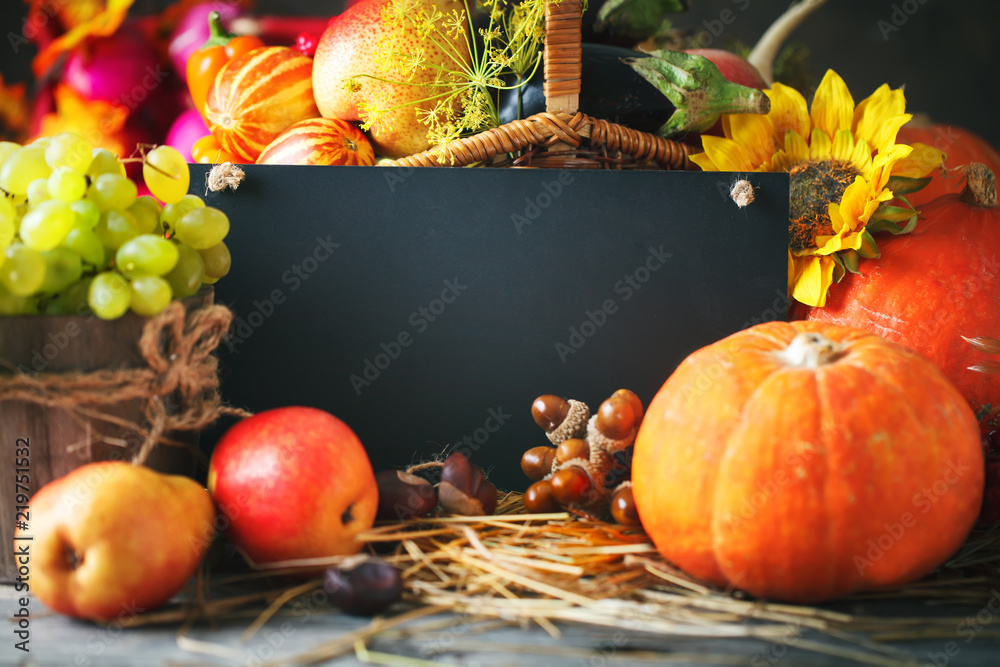 Happy Thanksgiving Day background, wooden table decorated with Pumpkins, Maize, fruits and autumn leaves. Harvest festival. Selective focus. Horizontal. Background with copy space.