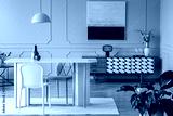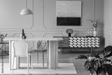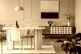 White chair and marble table under pink lamp in eclectic living room interior with painting above cabinet. Real photo