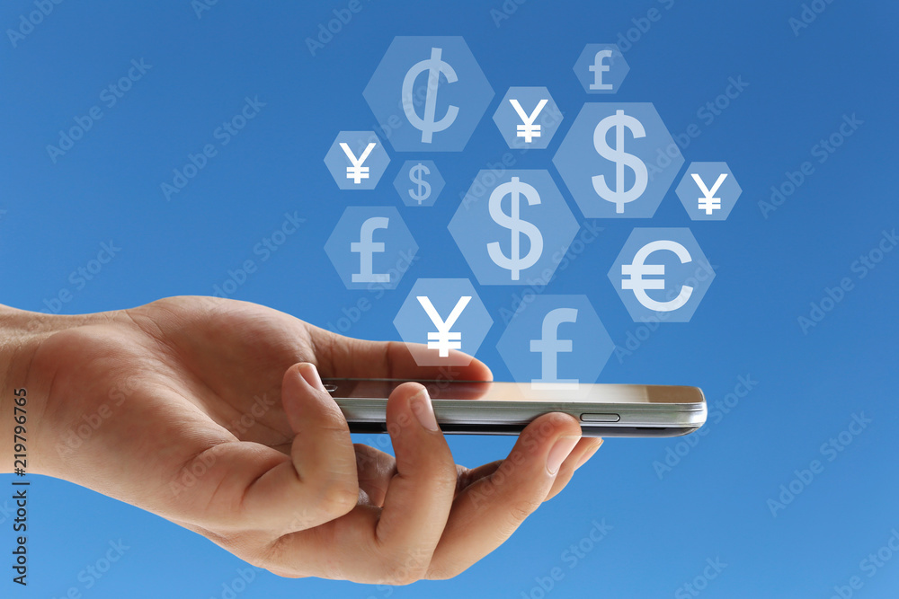 Hand of a businessman holding a smartphone and a financial symbol on blue background.