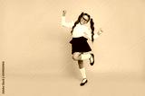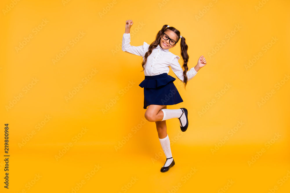 I'm happy because I'm going back to school! Full length, legs, body, size portrait of small girl isolated on bright yellow background stands on one leg raised her hands up