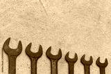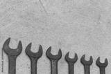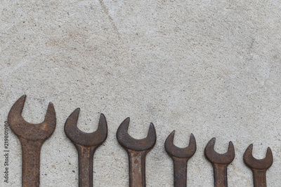 Old wrench tool with rust placed on the concrete floor background.