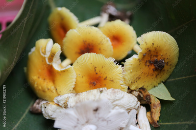 Fresh Yellow Amanita virosa of mushroom to can eat on green leaf.