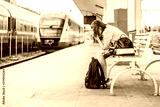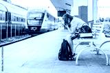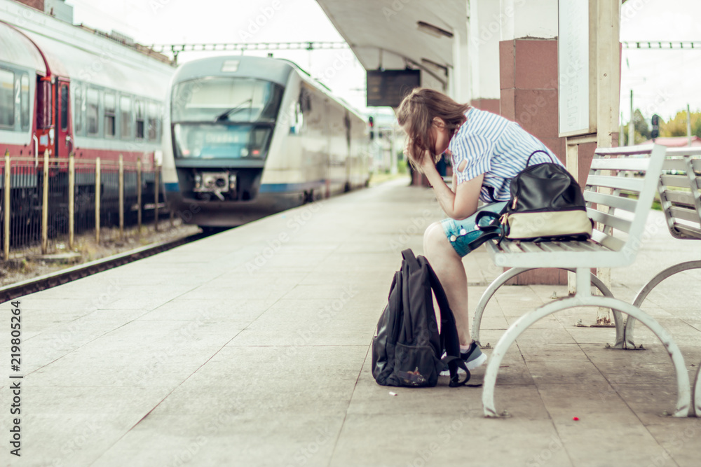 Sad young woman sitting on a banch in a train station. Teen waiting for the train in the middle of the day