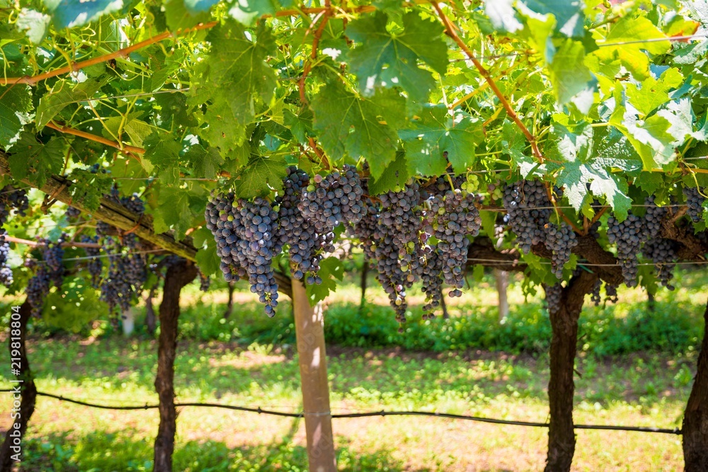 Dark wine grapes on tree on grapes plantation in Italy