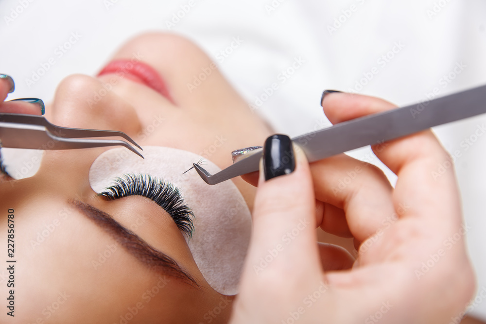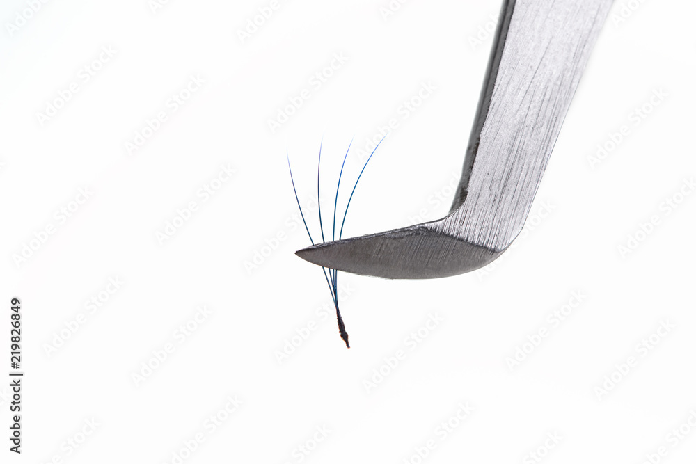 Eyelash Extension tools on white background. Accessories for eyelash extensions. Artificial Blue ombre lashes. 2D, closeup , selective focus.