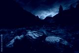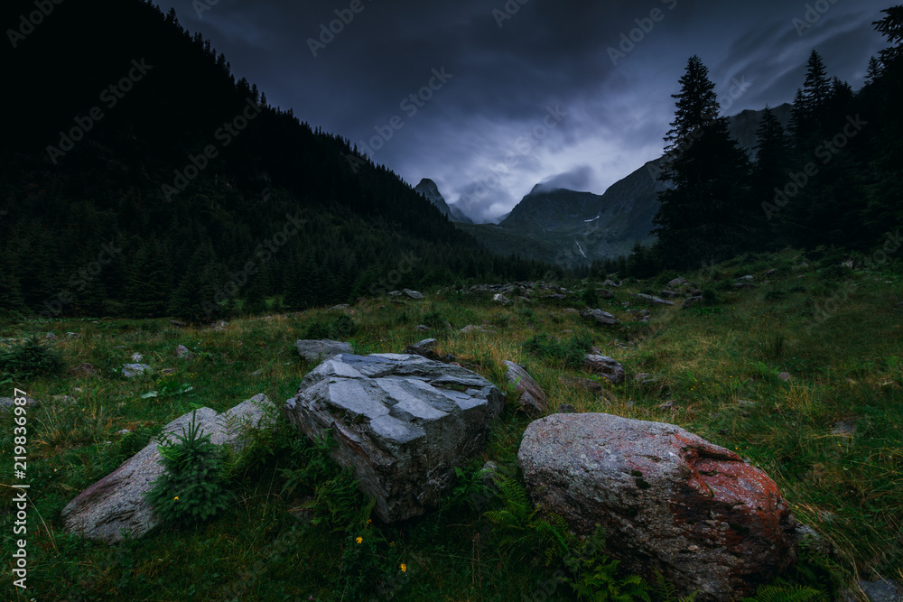 Mysterious and mystical view of the night mountains. Dramatic cloudy sky and mountain peaks in the fog. Fagaras Mountains.Transylvania. Romania.