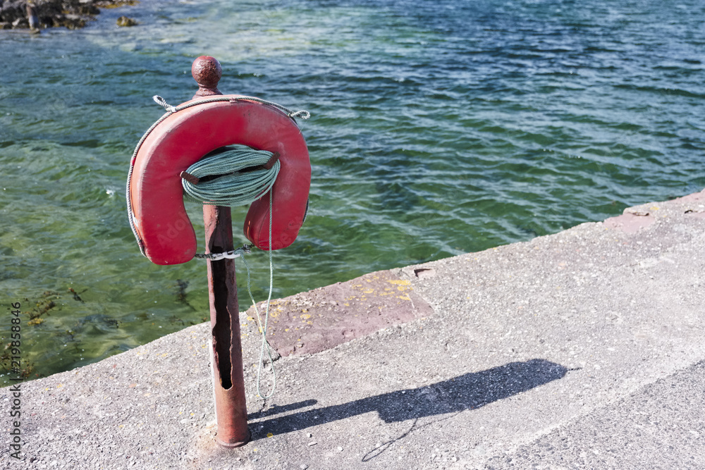 Old style foam buoy life water safety ring at sea dock port