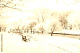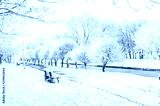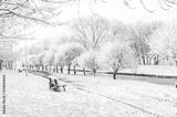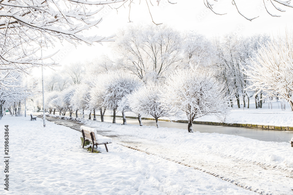 winter park, snow-covered trail above the river, some beautiful trees along the river
