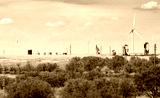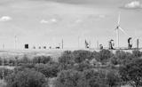 Typical landscape of Texas: endless fields, wind generators, oil pumps, rare green bushes