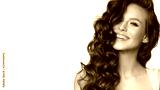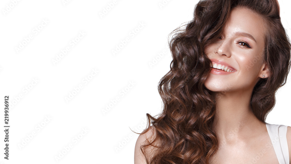 Beautiful young girl in white dress with natural make-up, hair curls and smile. Beauty face.