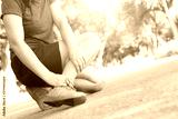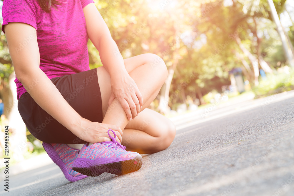 Woman suffering from an ankle injury while exercising. Running sport injury concept.