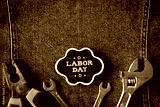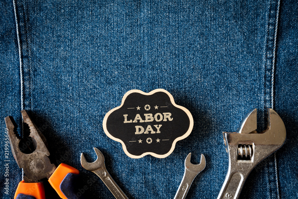 USA Labor day concept, First Monday in September. Different kinds on wrenches, handy tools, America flag and wooden tag on blue jeans background.
