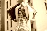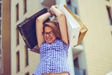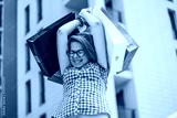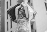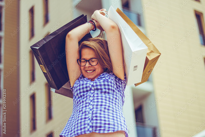 Happy girl after shopping holding bags above her head. excited woman with several shopping bags during the day