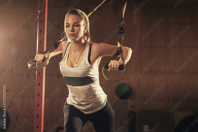 Woman athlete doing exercise in gym. Young attractive girl exercising with suspension trainer. Sportswoman working out in functional training. Workout. Sports.