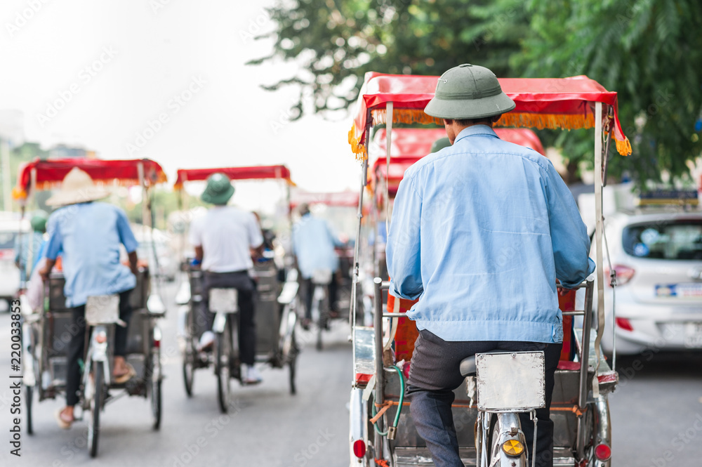 Traditional cyclo ride down the streets of Hanoi, Vietnam. The cyclo is a three-wheel bicycle taxi that appeared in Vietnam during the French colonial period.