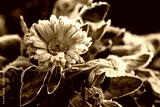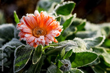 A bright flower is calendula, covered with frost. The first frosts in the garden_