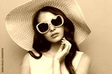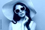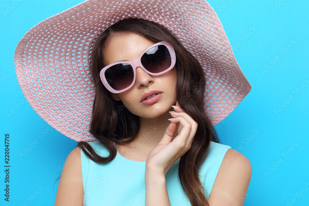 Fashion portrait of young woman wearing hat and sunglasses.