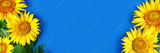 Beautiful sunflowers on blue background. View from above. Background with copy space.