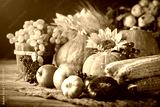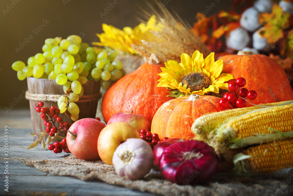 Happy Thanksgiving Day background, wooden table decorated with Pumpkins, Maize, fruits and autumn leaves. Harvest festival. Selective focus. Horizontal.