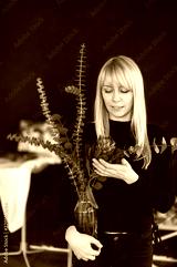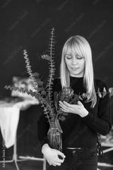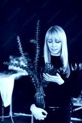 Flower a protea in hands at the blonde woman.