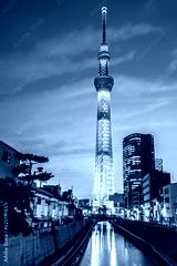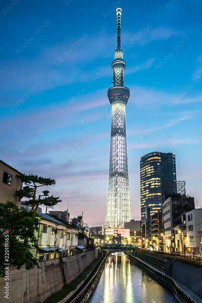TOKYO, JAPAN - June 22, 2018: Tokyo Skytree, Sumida Ward Urban night scene. Tokyo Skytree tower reflections on the canal. Tokyo Sky Tree is one of the famous landmark in Tokyo.