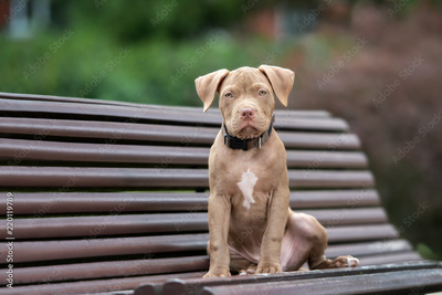 adorable american pit bull terrier puppy sitting outdoors on a bench