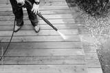 cleaning terrace with a power washer - high water pressure cleaner on wooden terrace surface