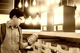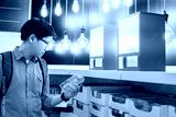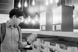Young Asian man choosing package of electrical light bulb in the store. Furniture home decoration shopping concept