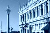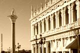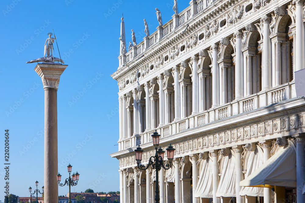 Venice, Saint Theodore statue and Marciana library facade in sunny day in Italy