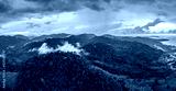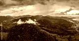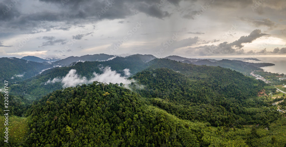 Aerial drone view of mist and low cloud over a dense tropical rain forest