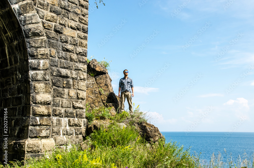 Young tourist with beard stays on a mountain with tunnel on a lake background.