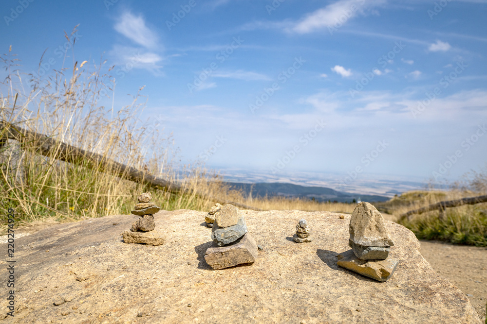 Small pebble stacks balancing on a large rock