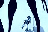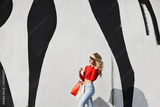 Sexy and beautiful blonde model girl with perfect body and in sunglasses, in stylish red sweatshirt and in fashionable jeans posing with shopping bags in her hand at modern background