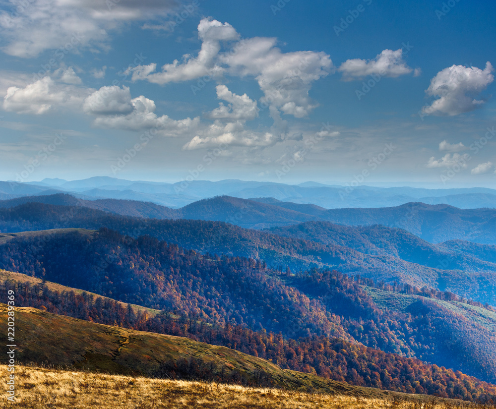 Idyllic landscape in the autumn mountains. View of the hills covered by forest in the distance.Travel background.