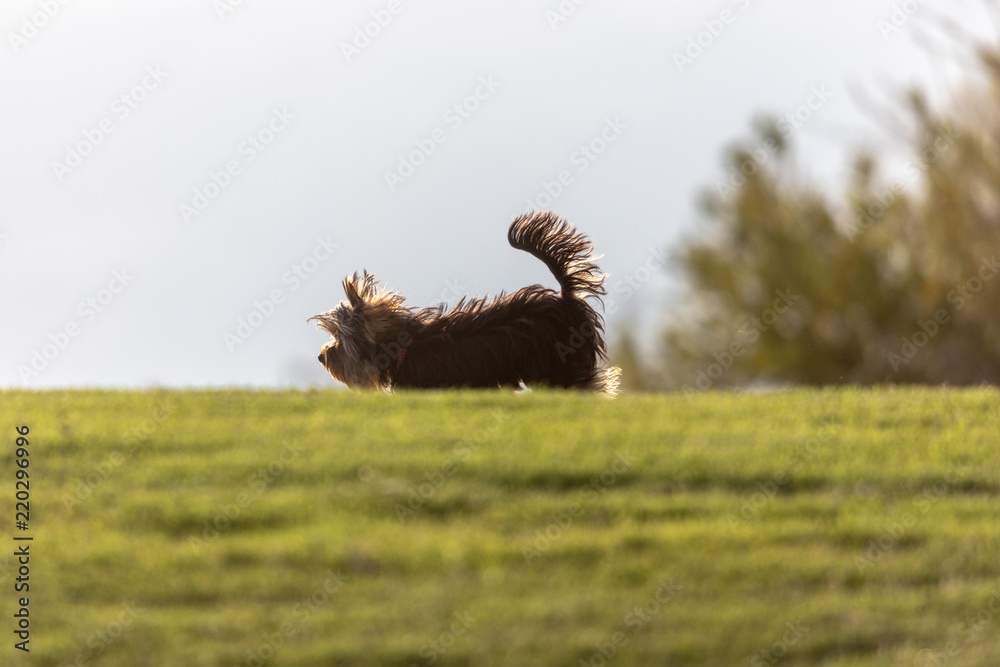 Yorkshire terrier running in a field.