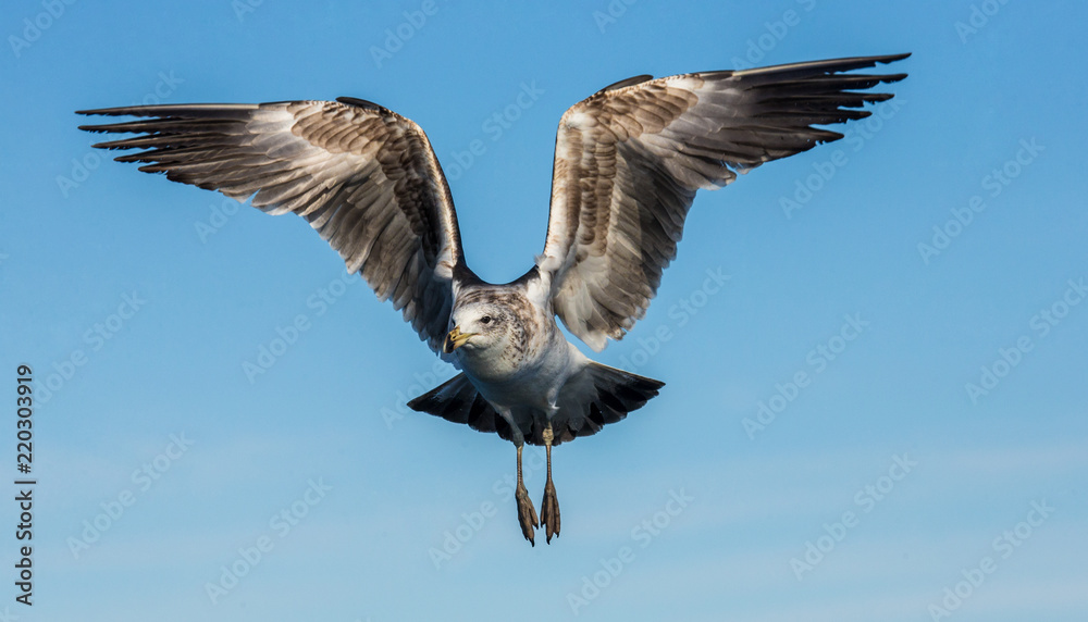 Seagull in flight against the blue sky. A beautiful moment of flight. Cape Town. False Bay. South Africa.