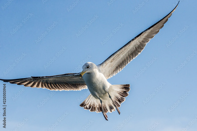 Seagull in flight against the blue sky. A beautiful moment of flight. Cape Town. False Bay. South Africa.