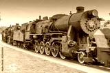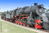 Steam locomotive with red wheels. Retro locomotive on rails.