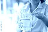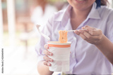 Hand of student holding cup of noodles.
