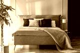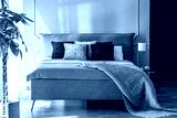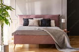 Black and grey pillows on pink bed in pastel bedroom interior with palm and lamp. Real photo