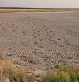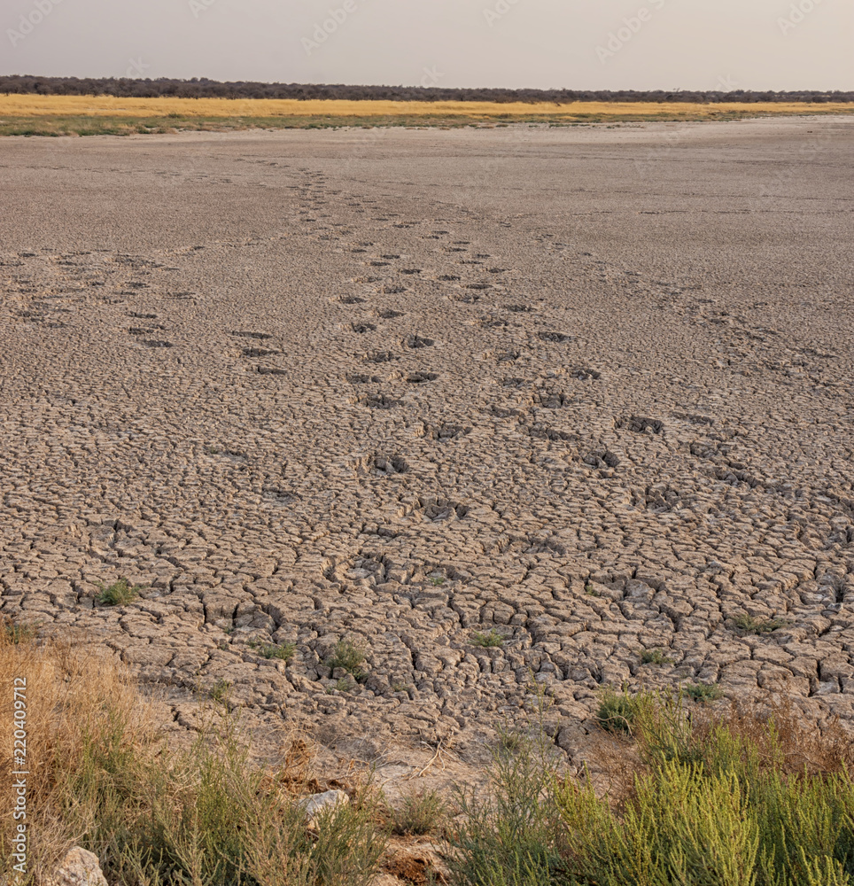 Animal tracks in hard baked mud in a dry riverbed in the Namibian savanna
