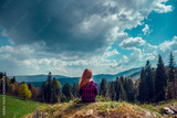 Woman back view standing down in grass in an alpine scenery. Mountain countryside view