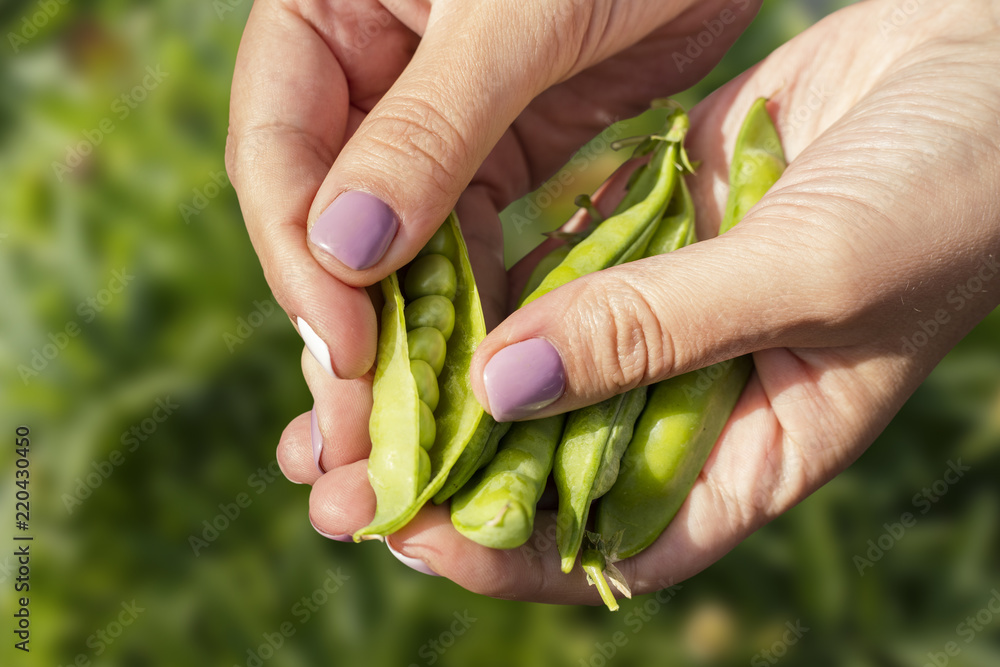 Open pea pod in the hands of a girl on a garden background. Copy space for your text