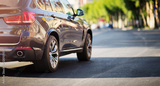 car on the road on sunny spring evening in city